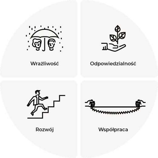 Po pierwsze ODPOWIEDZIALNOŚĆ za pracowników, klientów, partnerów biznesowych i lokalne społeczności. Wsłuchujemy się w potrzeby każdej z tych grup i na ich podstawie wyznaczmy kierunki działań. Po drugie WSPÓŁPRACA, dobra i uczciwa, w której cenimy odmienność opinii i pomysłów, ponieważ ona pozwala tworzyć najlepsze rozwiązania. Kolejna wartość to ROZWÓJ, zarówno ten wyrażający się w liczbie sprzedanych produktów czy wielkości inwestycji, jak i w przyjaznym miejscu pracy oraz możliwości rozwoju osobistego i zawodowego. I wreszcie WRAŻLIWOŚĆ, która pozwala zatrzymać się z uwagą, otworzyć na innych i docenić to, co na pozór niewidoczne.